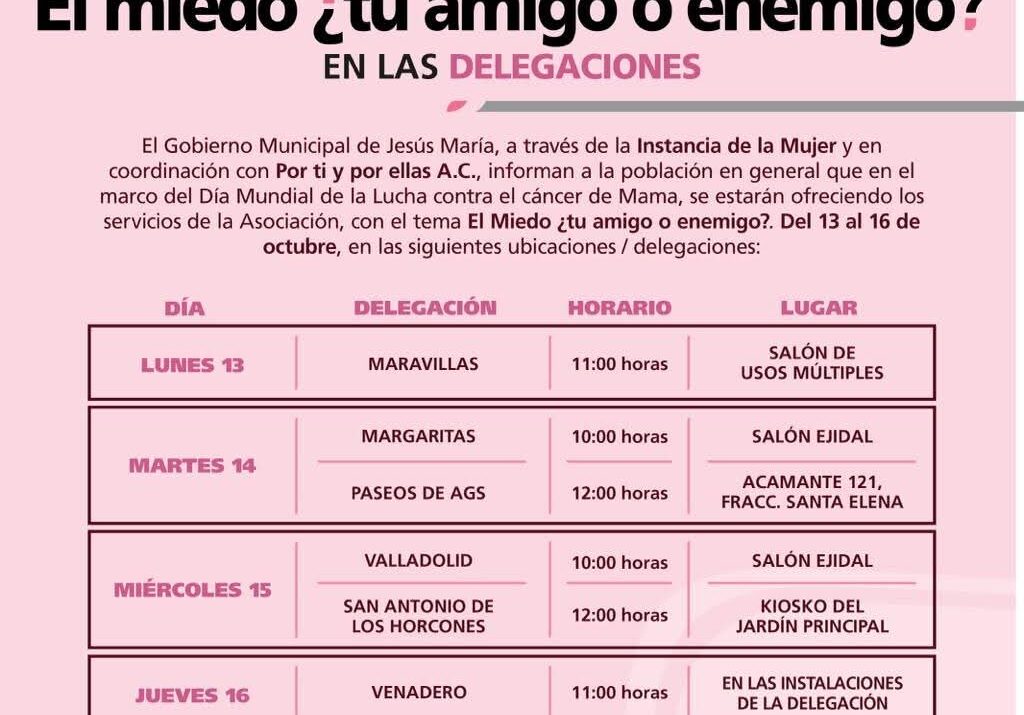En el marco del Mes Rosa, el Gobierno Municipal de Jesús María, a través de la Instancia de la Mujer y por primera vez en coordinación con la asociación Por Ti, Por Ellas A.C., realizará diversas actividades enfocadas en la concientización, detección y atención del cáncer de mama.