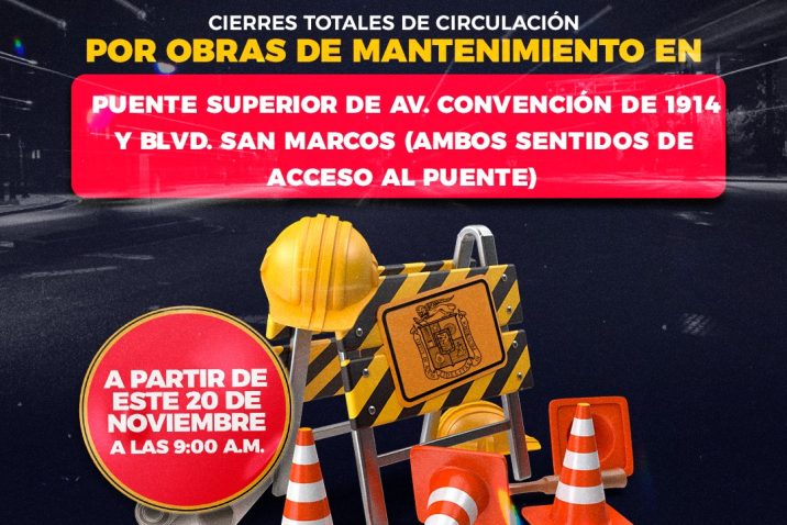 El Municipio de Aguascalientes, a través de la Secretaría de Obras Públicas Municipales, realizará trabajos de mantenimiento al puente superior ubicado en la av. Convención de 1914 oriente en el cruce con el blvd. San Marcos, por lo que se realizará el cierre total en ambos sentidos a partir de las 09:00 horas de este jueves 20 de noviembre.